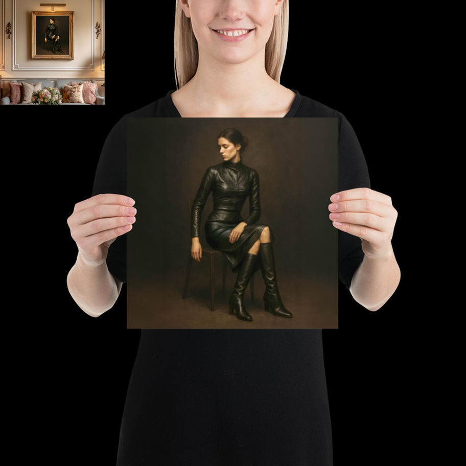 An imagined treasure from a royal collection that never was. Traditional portraits of the 18th and 19th centuries depicted women bound by the conventions of their time — silks, lace, jewels. Never leather. This portrait dares to rewrite that history.