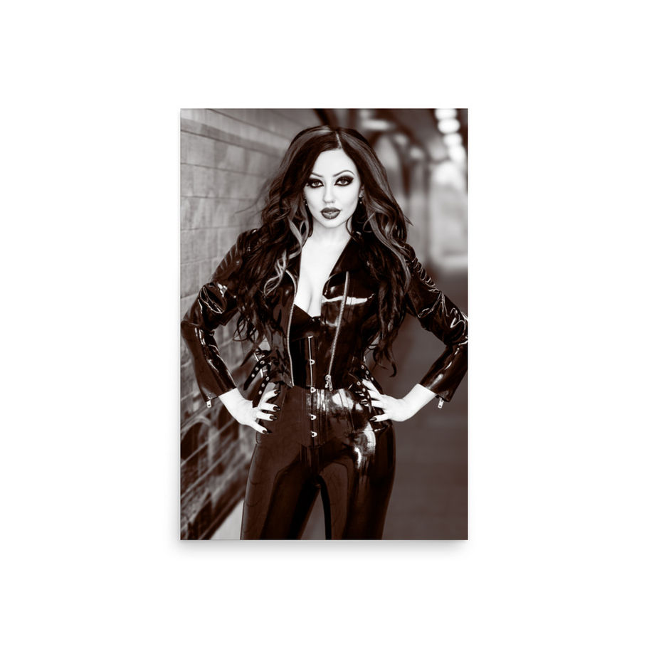 The glossy latex silhouette gleams against the grit of the city, the cinematic tunnel backdrop amplifying her presence—part icon, part enigma. The play of light across the reflective surface of her outfit draws the eye into texture and detail, while her poised stance and piercing gaze embody confidence, defiance, and allure.